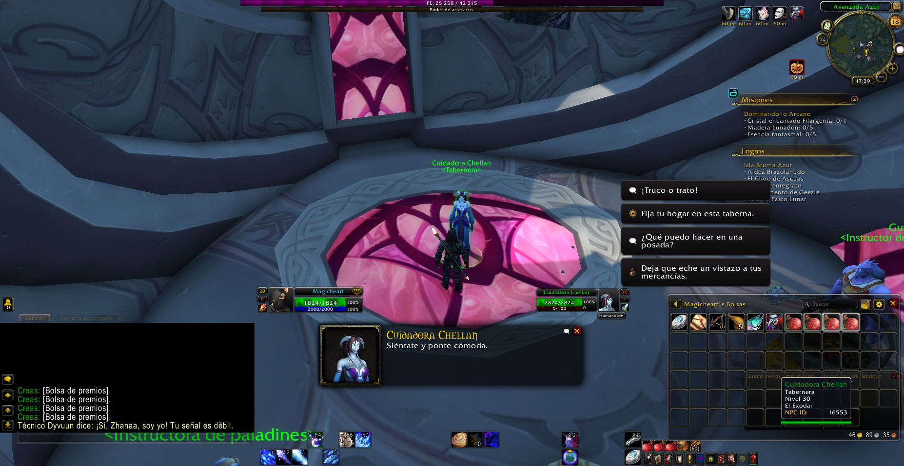 En el NPC Caregiver Chellan (de momento es el unico NPC con quien se puede hacer) se puede dar varias veces a la opción Trick or treat, cuando debería de poder hacerse cada 60min por tener el debuff, pero aun con el debuff se puede seguir obteniendo trajes y varias Treat Bag que deberian contener diversos items, en la expansión actual esta bosa ya no se obtiene, para saber sus items se debe buscar en la pagina de wow classic, también adjunto ese enlace.