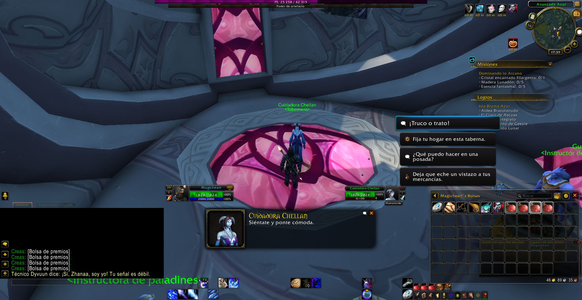 En el NPC Caregiver Chellan (de momento es el unico NPC con quien se puede hacer) se puede dar varias veces a la opción Trick or treat, cuando debería de poder hacerse cada 60min por tener el debuff, pero aun con el debuff se puede seguir obteniendo trajes y varias Treat Bag que deberian contener diversos items, en la expansión actual esta bosa ya no se obtiene, para saber sus items se debe buscar en la pagina de wow classic, también adjunto ese enlace.