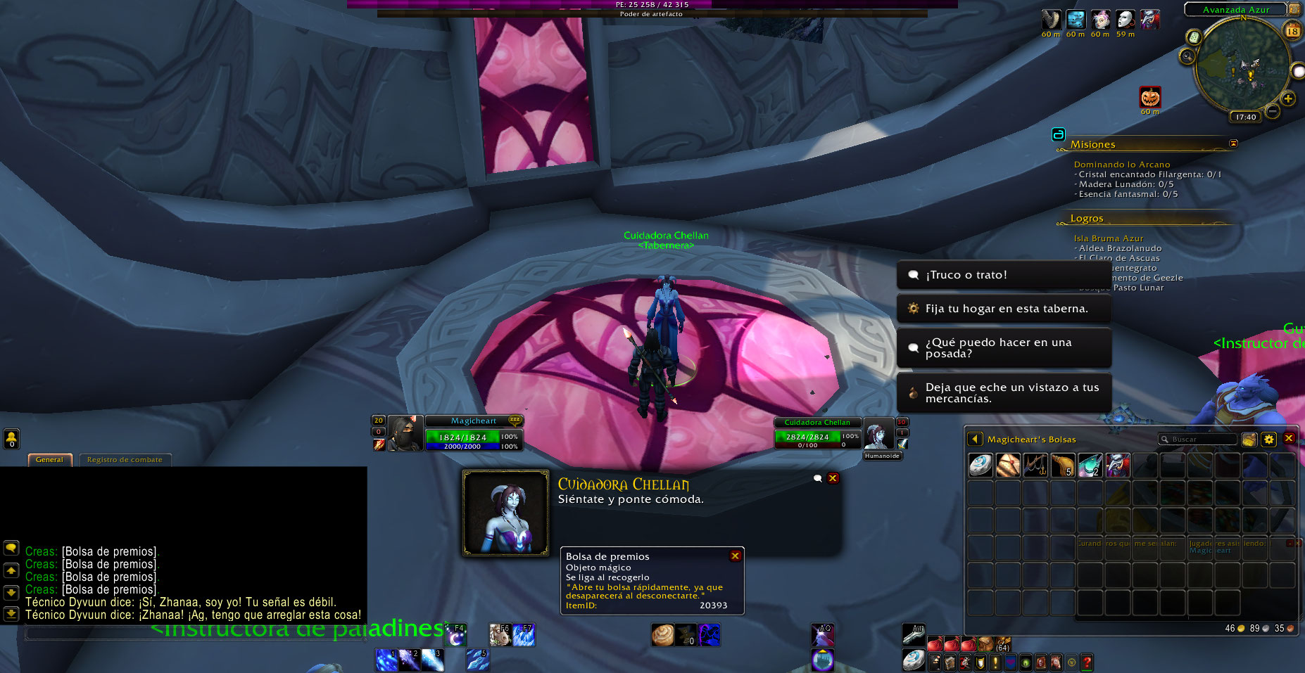 En el NPC Caregiver Chellan (de momento es el unico NPC con quien se puede hacer) se puede dar varias veces a la opción Trick or treat, cuando debería de poder hacerse cada 60min por tener el debuff, pero aun con el debuff se puede seguir obteniendo trajes y varias Treat Bag que deberian contener diversos items, en la expansión actual esta bosa ya no se obtiene, para saber sus items se debe buscar en la pagina de wow classic, también adjunto ese enlace.