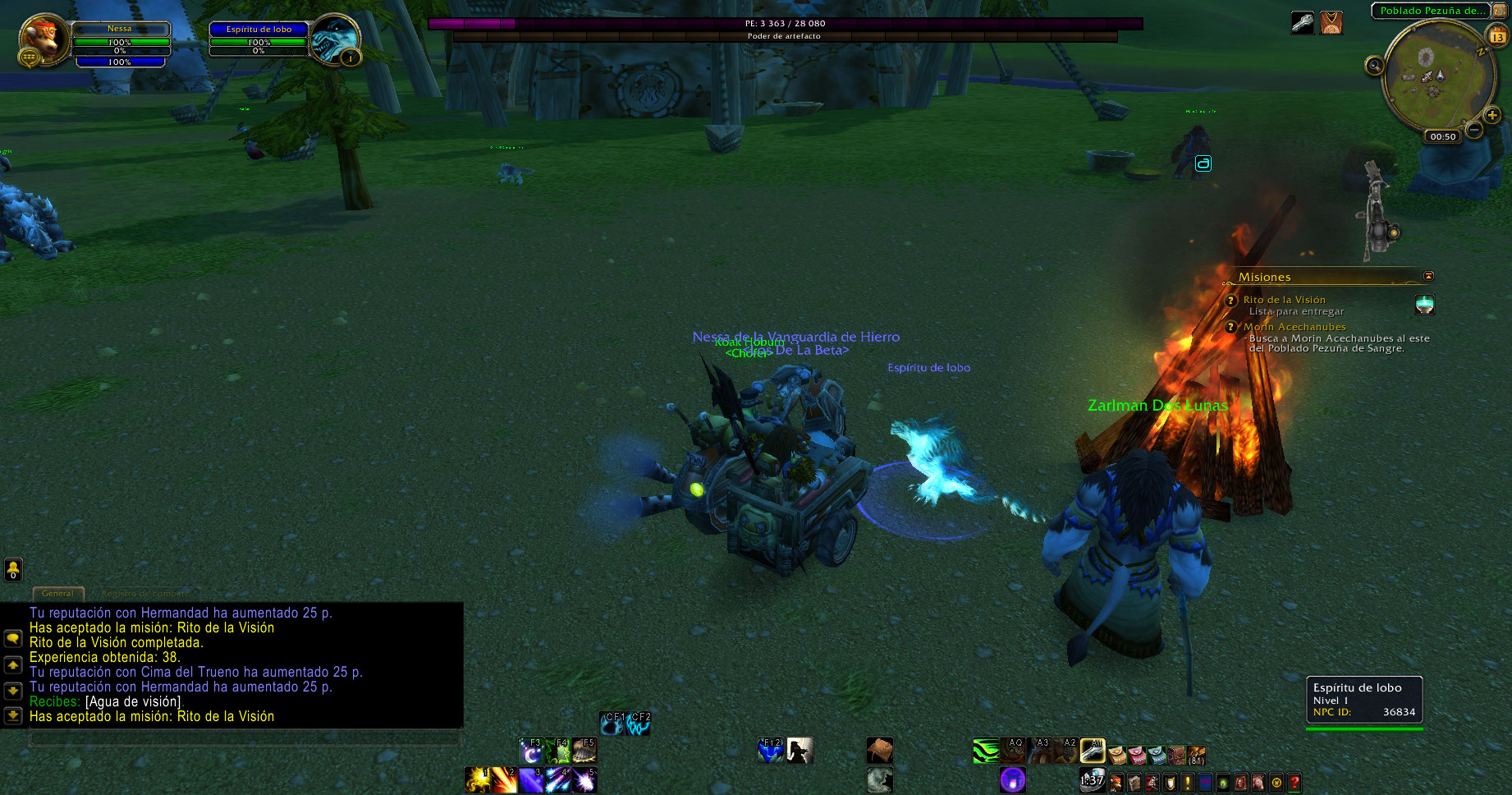 Al darle click al objeto Water of the Seers aparece un NPC Wolf Spirit y no hace nada, cuando debería de llevar al jugador hasta donde se entrega la misión, adjunto dos videos donde se ve el desarrollo de la misión, una donde el jugador sigue al lobo y otro donde al jugador transforman a lobo y automáticamente va a la zona de entrega.
